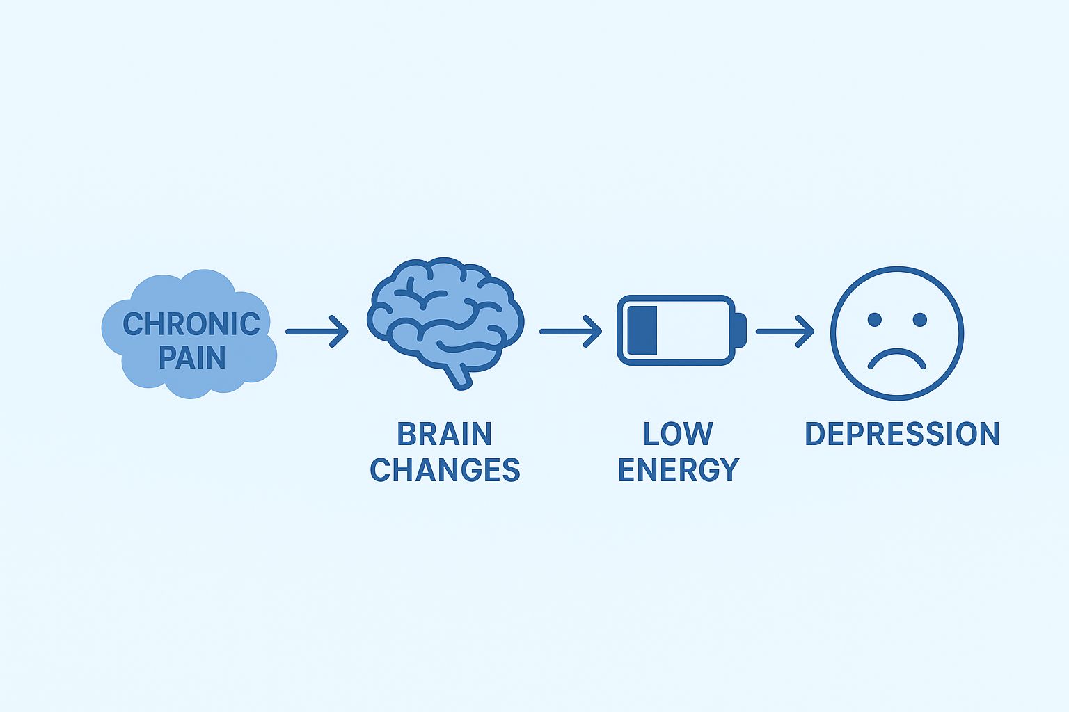 Long-term pain drains the brain’s energy reserves, making it harder to think, feel emotionally steady, or stay motivated. As Price et al. (2018) noted, bioenergetic failure — the brain literally running out of cellular fuel — is a core driver of depression and treatment resistance.